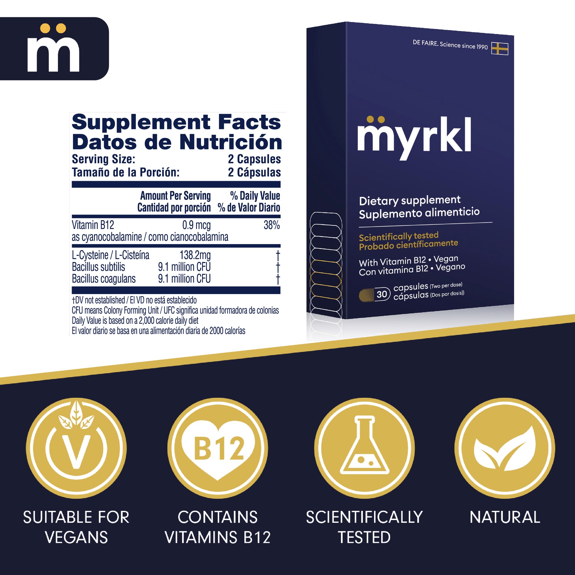 Myrkl is a patented food supplement containing a science-based formula made up of high performing bacteria, L-Cysteine & Vitamin B12.